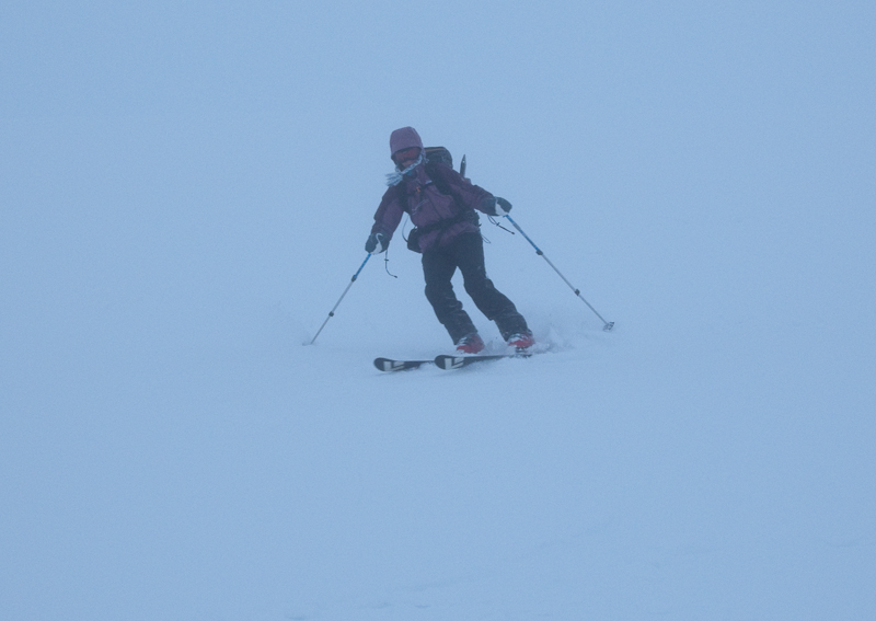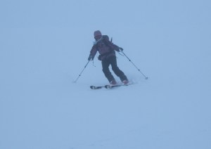 From the top we went West down on to the Cairngorm plateau and down Raibert’s Gully. The snow was great but in true fashion for this area, we could not see a thing!