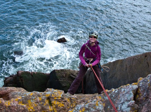 and gave a whopper smile, she was loving it. With the first route in the bag we abseiled back down again (with the customary yank to the anchor) and moved around the cliff on a ledge, form here we anchored ourselves in again and Matt led the next one
