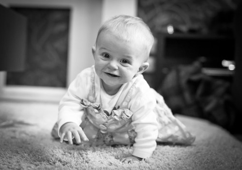 When i say playing there is nothing intellectual going on here, she is not making towers or spelling out words. She mainly just throws them around and waits for us to pick them up and place them back in front of her before she throws them around again. When she gets bored of this she does laps around the coffee table with her new found crawling skills.