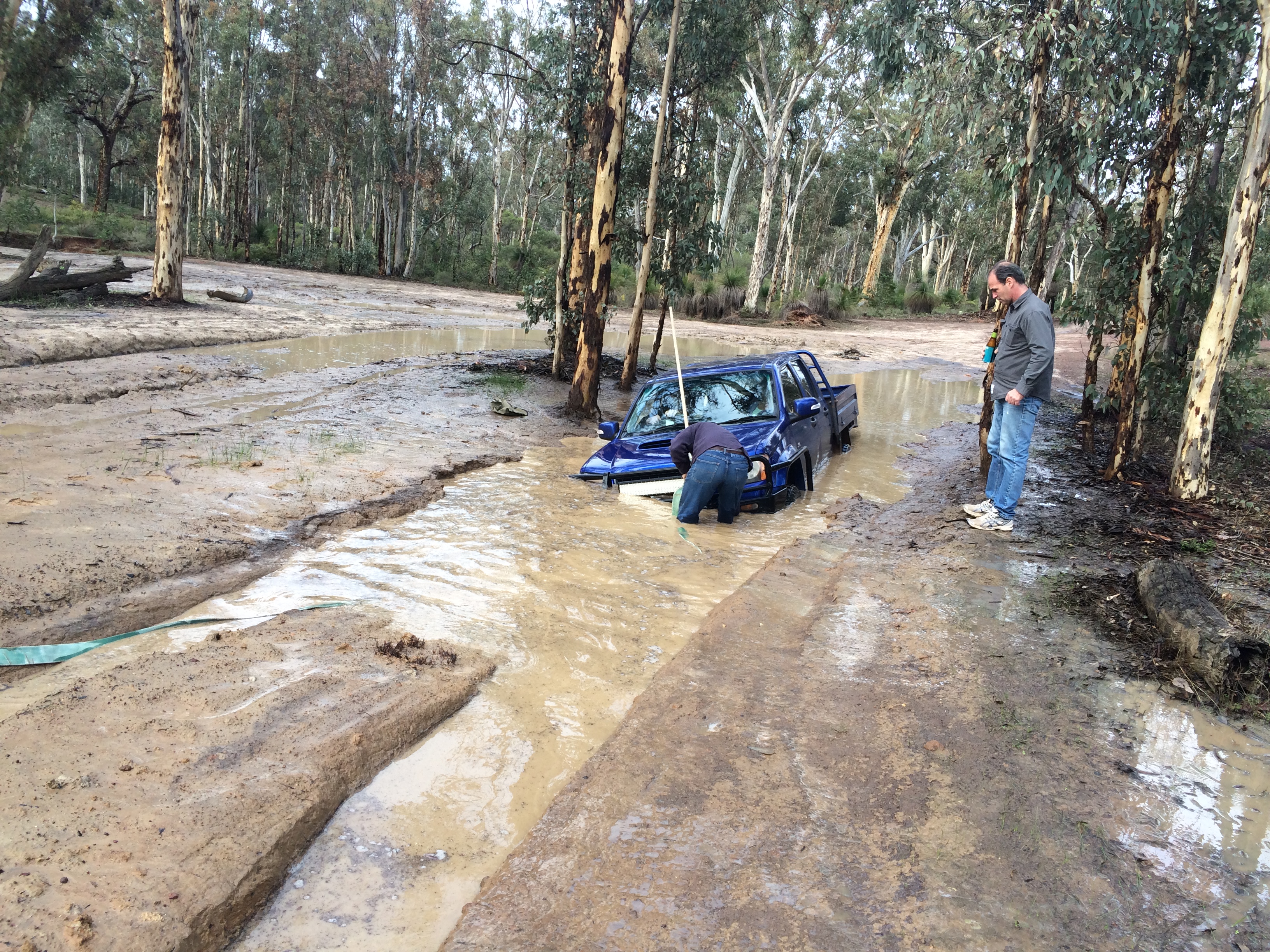 Ryan had to jump into the puddle and fish around under water until he found where the recovery point was ( wasn’t pleasant as there was a dead rotting Kangaroo next to it that stunk). We pulled the car out of the hole and assessed the damage.