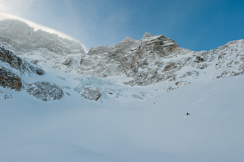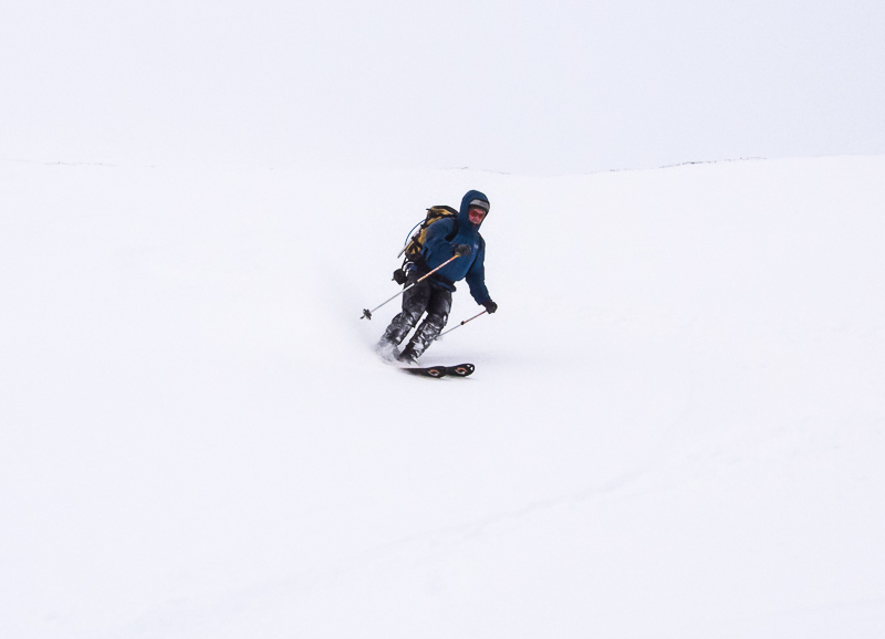 Eventually we decided on using a deadman (like a stake you stick into the snow to use as an anchor) and Scott had a bit of rope in his rucksack, we lowered ourselves to the bottom of the rope (10m) and then from there skied the rest. Once I was at the end of the rope it was obvious that it was not as bad as I thought it was, but that was with the hindsight of being able to see further down to where it was not as steep. Never mind. The rest of the line was great, the snow had softened up a bit and the turns were opened up and some fast carving turns out the gully were enjoyed.