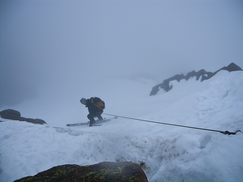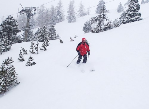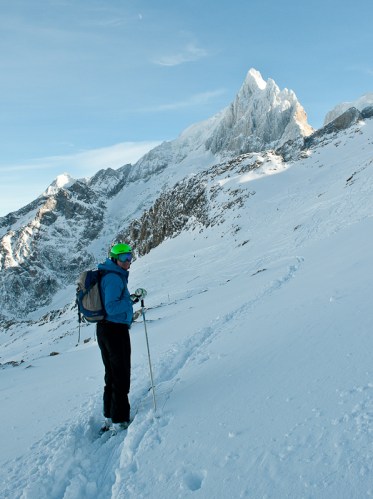 On getting to the top, we dug a small platform and put our skis on. I had not been skiing since Xmas in Gap, so was more hesitant than normal.