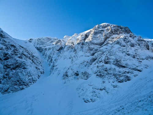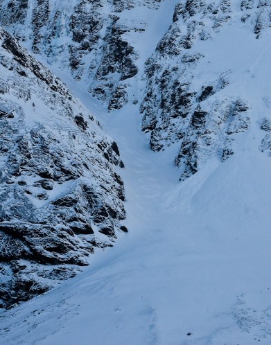 Above is Scott about to set off down ‘Glissade Gully’. The snow was pretty good, maybe just a tad on the hard side but soft enough to slow us down. A good descent, got to the bottom of the snow line, big smiles. Below is me coming out of the steeper part of the gully.