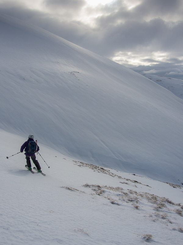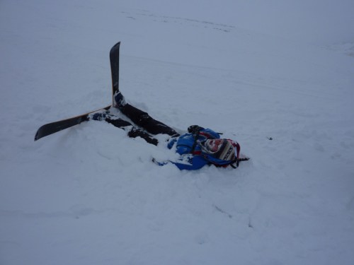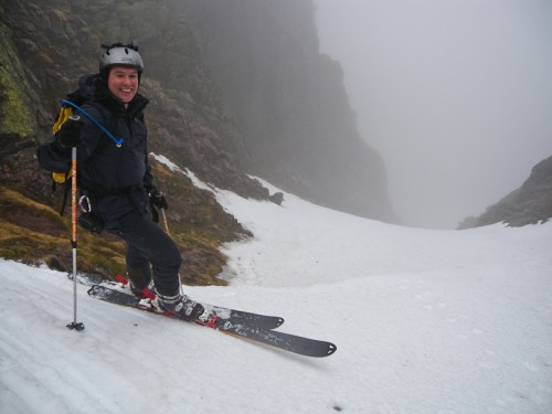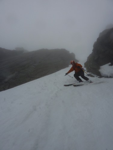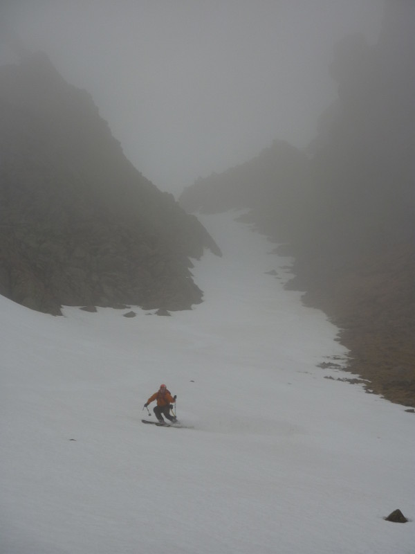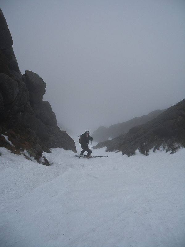 Above is Scott setting off down Narrow Gully. It was another good descent inducing smiles, graded Scottish I for climbing. All the way to the end of the snow line we went, then had a small traverse back to the bottom, part of this was rocks so skis were on and off. I had the misfortune of having my right leg disappear into a hollow. only stoppingonce my groin had hit the snow. 3 -5 minutes later, the nausea stopped and I carried on my way albiet with a slighter higher pitch voice.