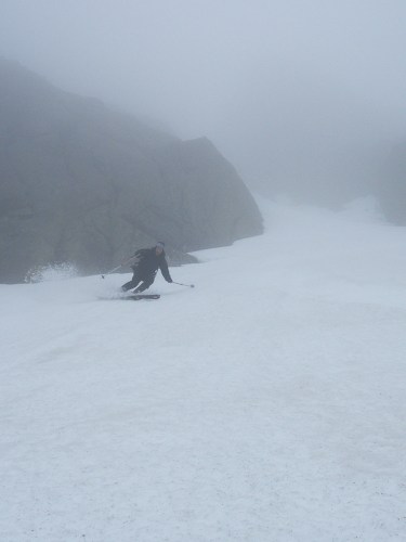 Once at the top we had to wonder around a bit to find the opening of the Gully. The top was a little thin so we had to down climb a nasty little crumbly bit to get to were we could ski from.