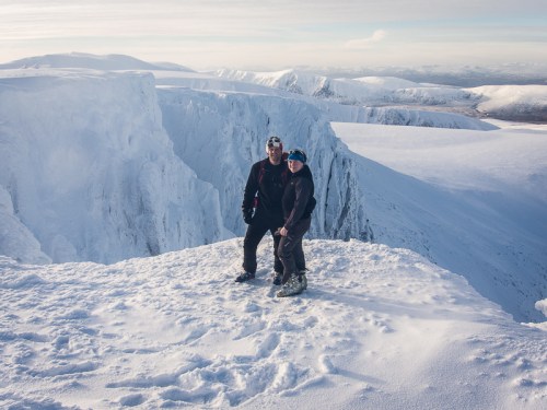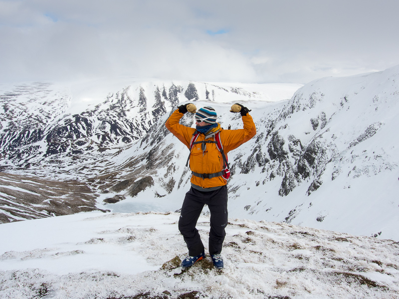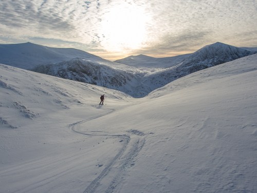 That was enough for me, and Scott and I emailed each other back and forth and made a plan to go skiing on Saturday. It was an early meet in the Linn of Dee car park and skis were mounted on our rucksacks and then slung onto our backs. A slight wobble and swear at the weight of our rucksacks and we were off. It is a fairly long approach to the Corrie, just under three hours. but it was not a bore as I hadn’t seen Scott for a while and it was a good time for a catch up.