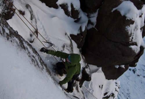 The small crag can be seen in the back ground, 2 hours of thigh deep snow trudging up to the small rocky outcrop on the top. We were all fairly buggered by the time we got there, the wind had picked up and spindrift was everywhere! spirits were not high to go climbing. We found a small sheltered hollow in the crag and got changed into some dry clothes and had some food. I also would like to thank my wife for one of my xmas presents. A thermos flask. Hot ribena is the bollocks when you can’t feel your hands and it warms you up beautifully. shall take that everywhere with me this winter.