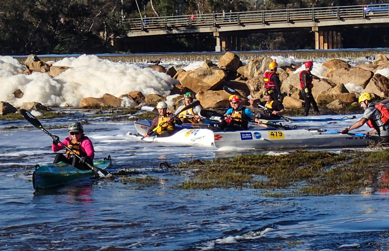 people were set off in groups of 10 in 30 second intervals. I was doing the next leg so got to watch them all go. The first obstacle was Northam weir. A 10m concrete chute that turned a lot of people sideways and caused a lot of pile ups
