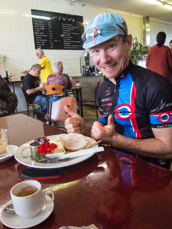 Ian with his pancakes and coffee. It was awesome! After an hour of eating and sitting around we realised that we needed to get a shift on as we had to ride another 90km on top of the already cycled 20km to get to the evening destination. Off we set with bellies full of pancakes at a slower pace than normal.