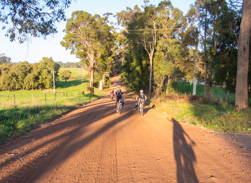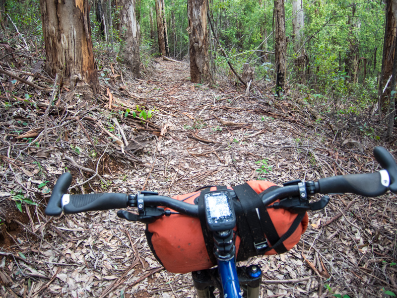 The last climb. A typical bit of path. The Karri trees shed their bark in the heat to keep cool, so the forest floor is littered with the bits of bark! Had to be quite careful as bits flicked up everywhere and we all stupidly said “we are going to be lucky to get through this with our rear mechs in place” a kiss of death for the next few days of sure!